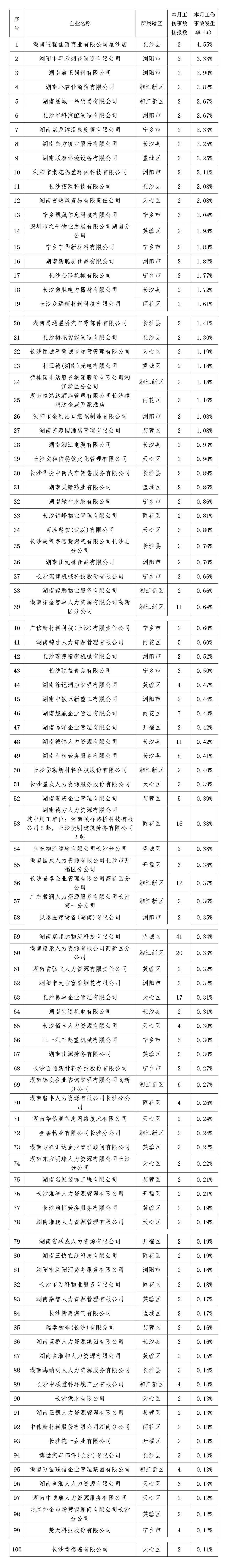 根据申报情况,工伤事故发生率排名前100名的企业中,长沙县15家49起,天心区14家48起,芙蓉区14家37起,湘江新区13家71起,浏阳市12家24起,宁乡市11家30起,雨花区10家45起,望城区6家51起,开福区5家11起。劳务派遣公司合作的用工单位当月申报3起及以上工伤事故的,用工单位同步公布。